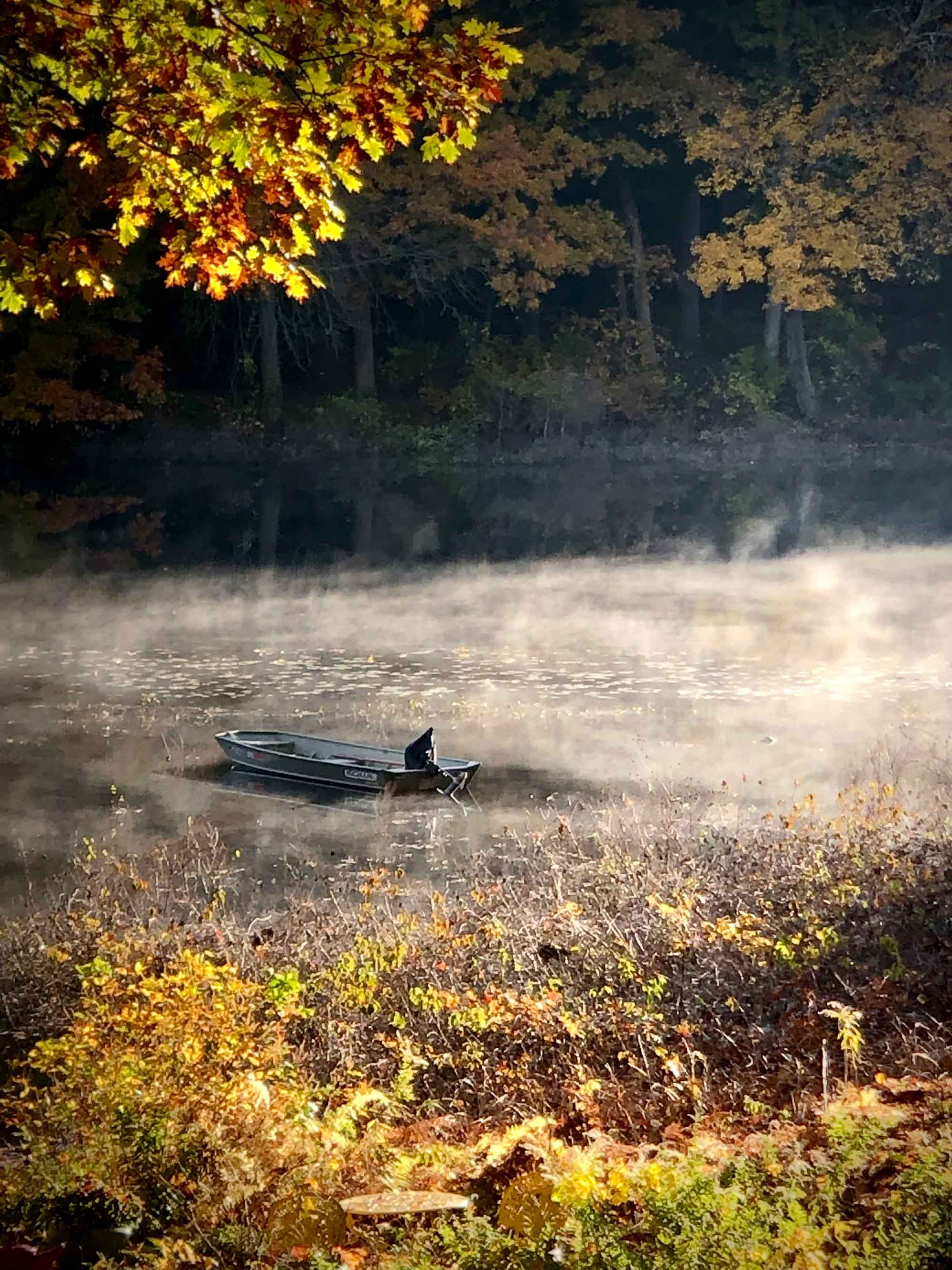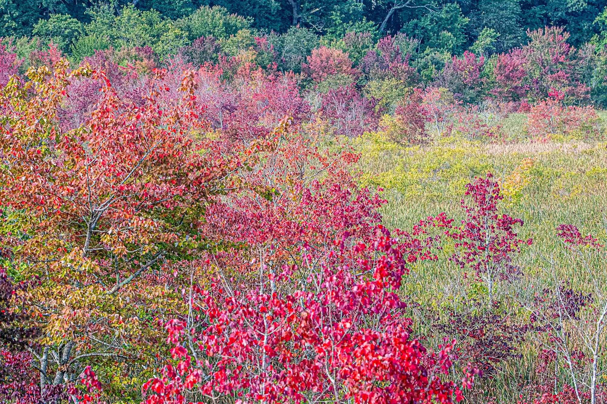 The colors of Concord in fall are so beautiful they bring a glow to our minds and a smile to our faces. The reds, oranges, and yellows against a green background are emphasized as they reflect in our waterways. The early morning and evening mists soften views such as Gowing Swamp behind St. Bernards Cemetery. The swamp has much vegetation that likes the acidic terrain, such as blueberry bushes that turn red in the fall. The tower at Great Meadows also shows lovely fall colors.