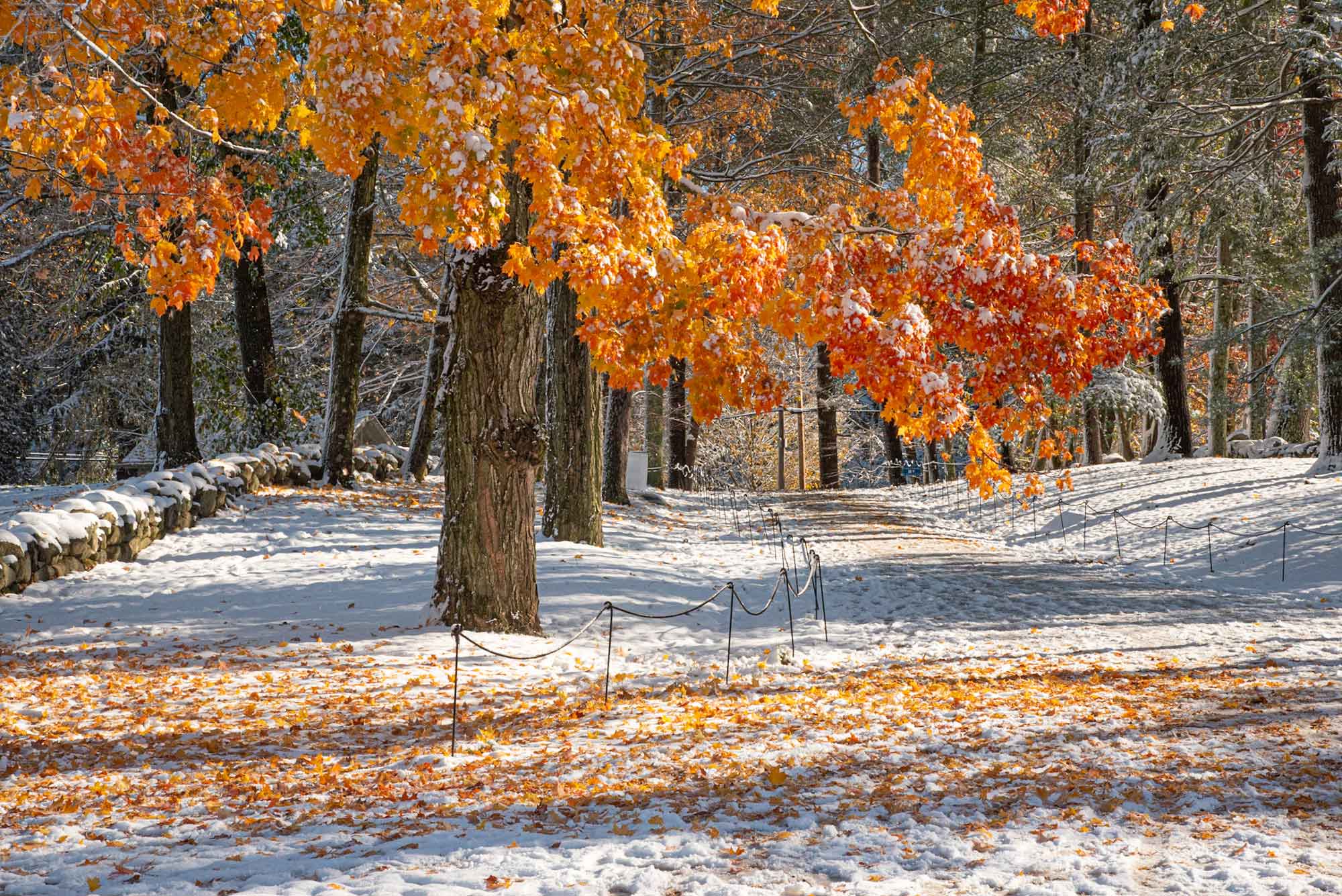 This photo, taken October 30, 2020, shows the beautiful fall colors and a light dusting of snow at Minute Man National Historical Park. The Old North Bridge offered a snow-covered view of the Battle Road.