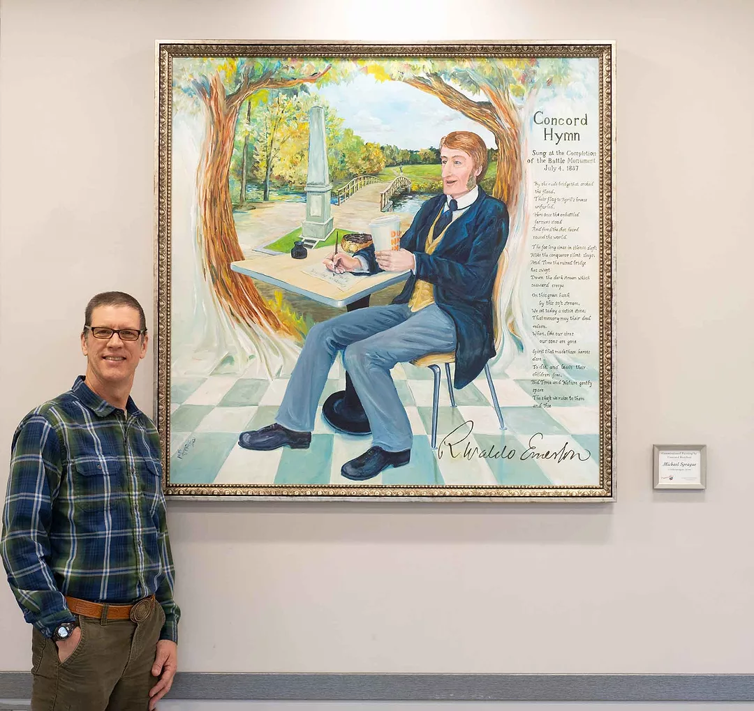 Keeping with their tradition of supporting the community, Megan and Mark looked around for a local artist to commission three paintings featuring Henry David Thoreau, Ralph Waldo Emerson, and the Alcott family with a whimsical twist – they would be enjoying a cup of Dunkin’ coffee while writing, or treating themselves to a snack while picnicking on the lawn. The Pesces reached out to Margot Kimball of Village Art Room and were introduced to West Concord artist and resident Michael Sprague.