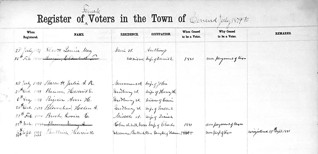 In another first, on July 23, 1879, the first woman to register her name to vote in Concord was Louisa May Alcott. She wrote the following in her journal, “Was the first woman to register my name as a voter,” and playfully mused after voting in her first election that “no bolt fell on our audacious heads, no earthquake shook the town.”
