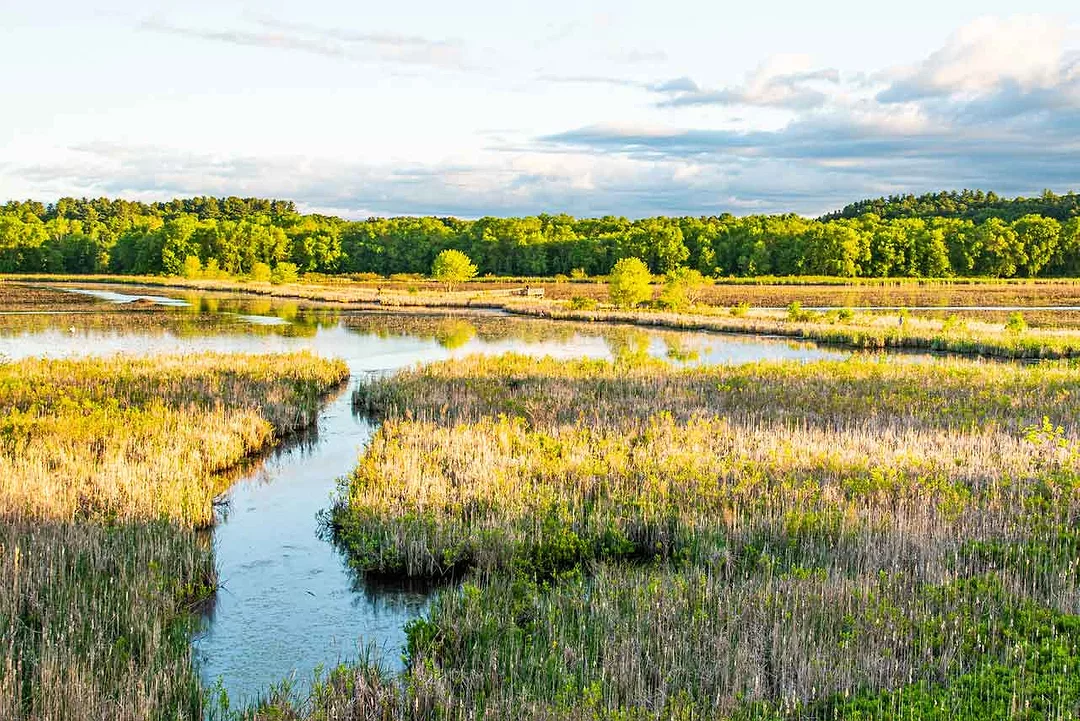 Great Meadows is a favorite place for those who enjoy quiet walks with lots of birds, critters, and special plants. It is an easy walk from town via the rail bed off Monument Street. There are several nice viewing spots including the tower at the parking lot off Munson Road, the deck on the causeway, and benches scattered around the trails. Great Meadows encompasses (looking west to east) Borden Pond, the upper impoundment, and the lower impoundment. The causeway runs between the upper and lower impoundments, and leads down to the Concord River. A trail to the left (north) of the causeway goes around the lower impoundment and back to the rail bed and parking lot. The best times to visit are early and late in the day – these are the best times to see the wildlife and to take pictures.