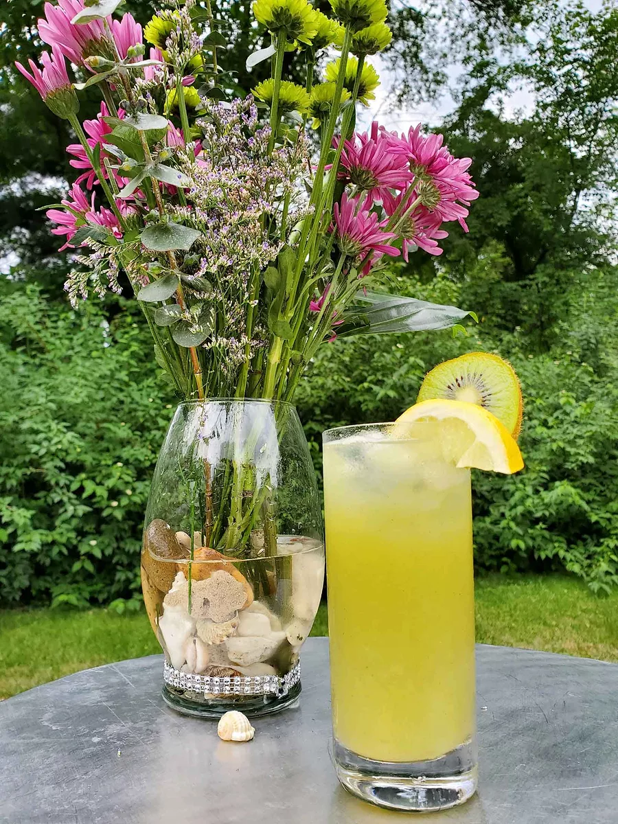 Combine all ingredients in shaker. Add ice and shake for 15 seconds. Strain over fresh ice in a high ball or collin’s glass. Garnish with a slice of kiwi and a slice of lemon.