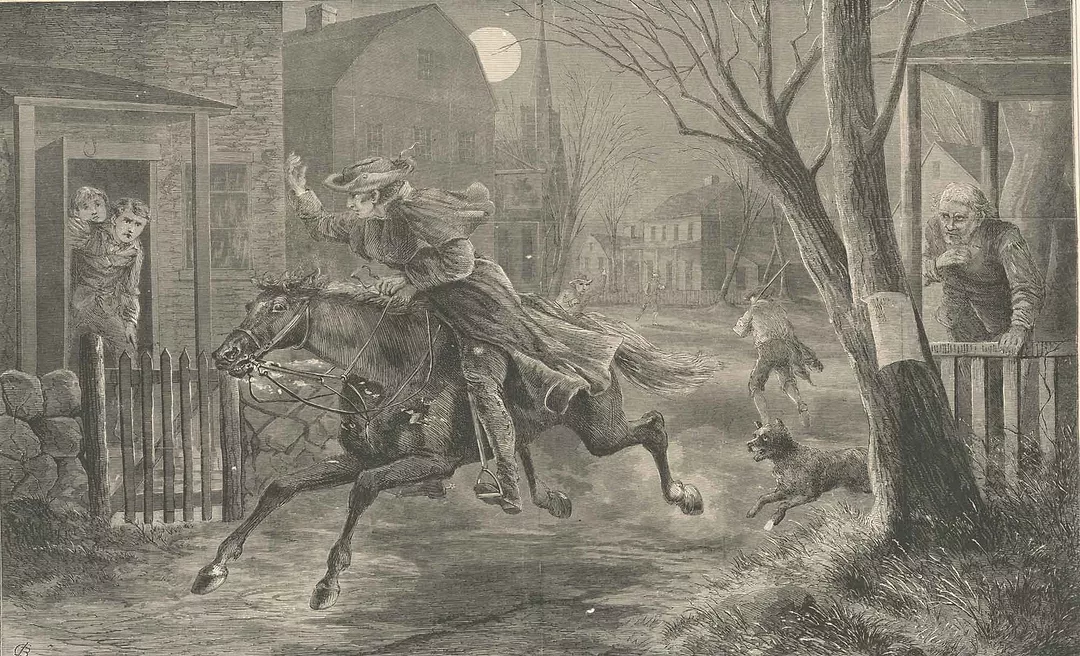 After equipping himself, Revere rowed across the Charles River to Charlestown, evading the HMS Somerset. He quickly borrowed a horse and was warned that several British patrols might try to intercept him. Revere alerted militia captain Isaac Hall in Medford and roused residents throughout Menotomy, warning them that the “Regulars were out.” He reached Lexington after midnight.2